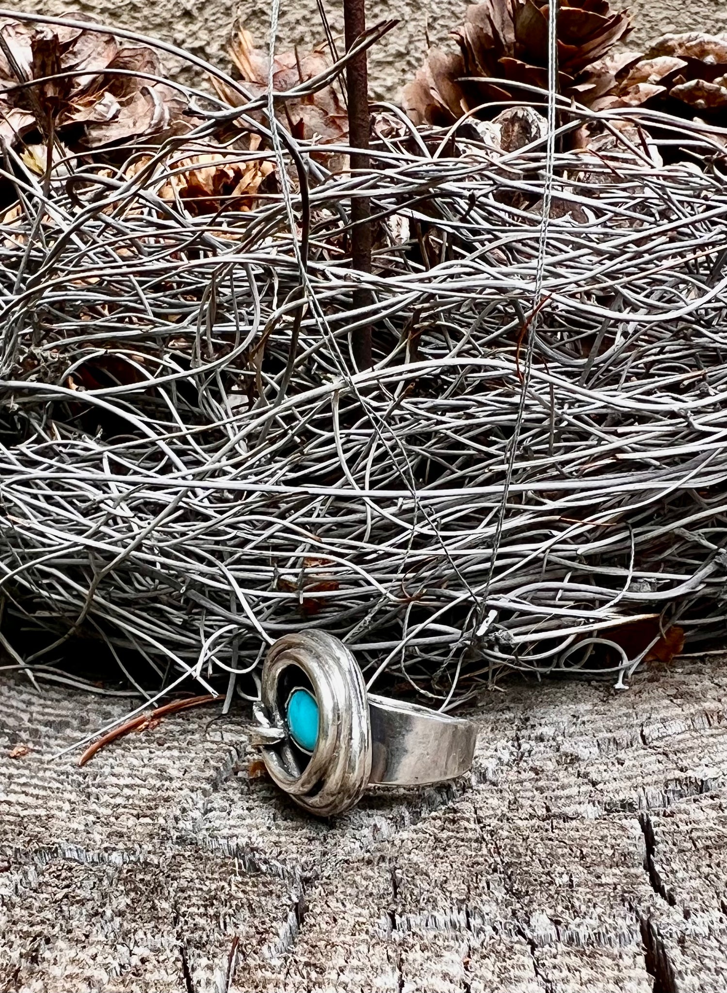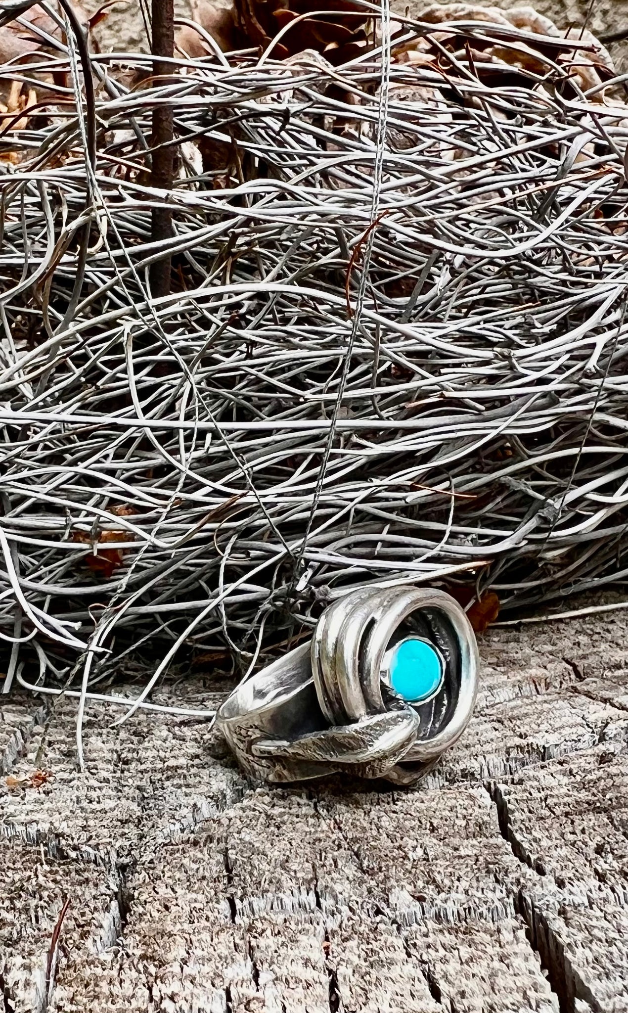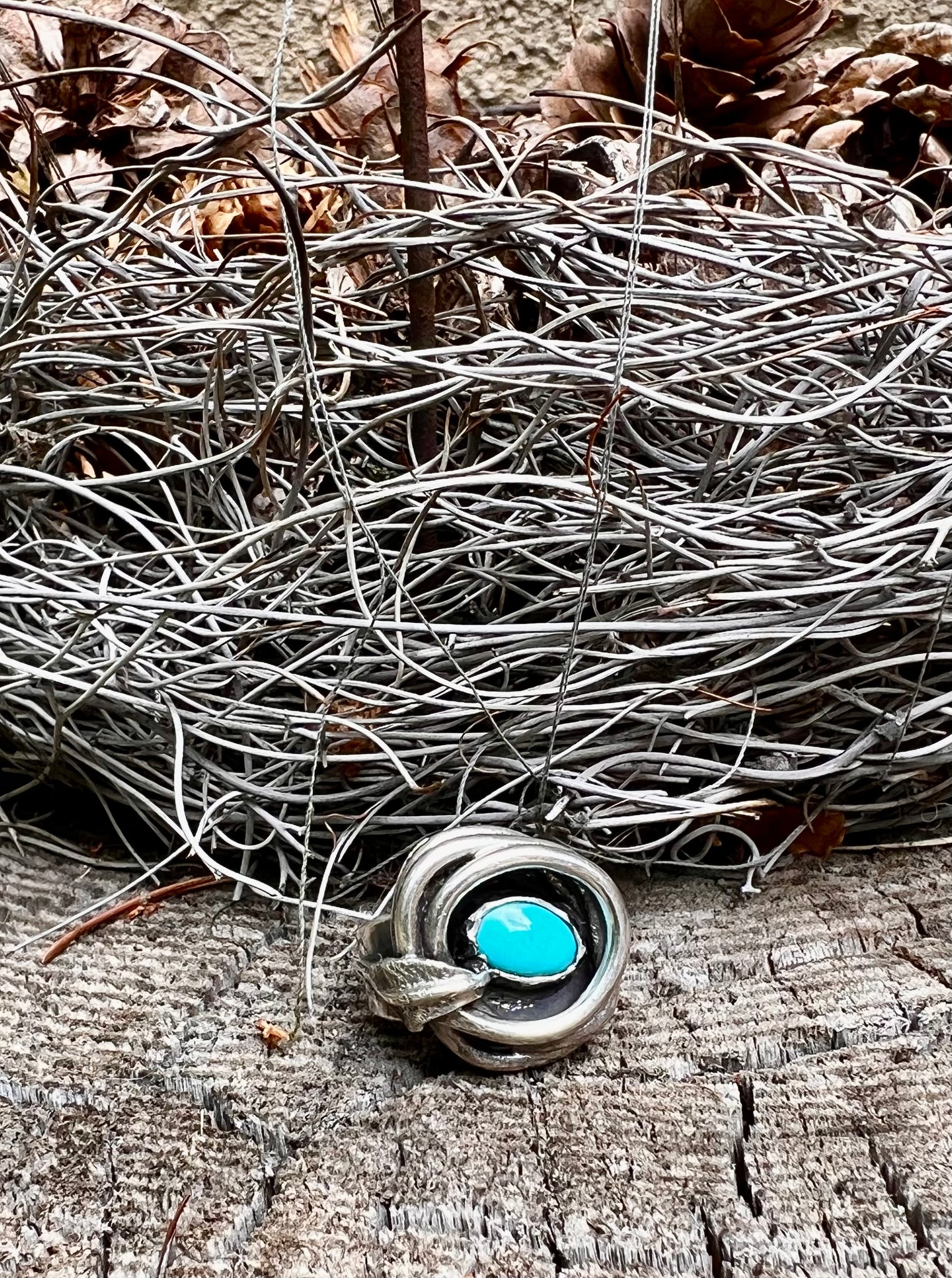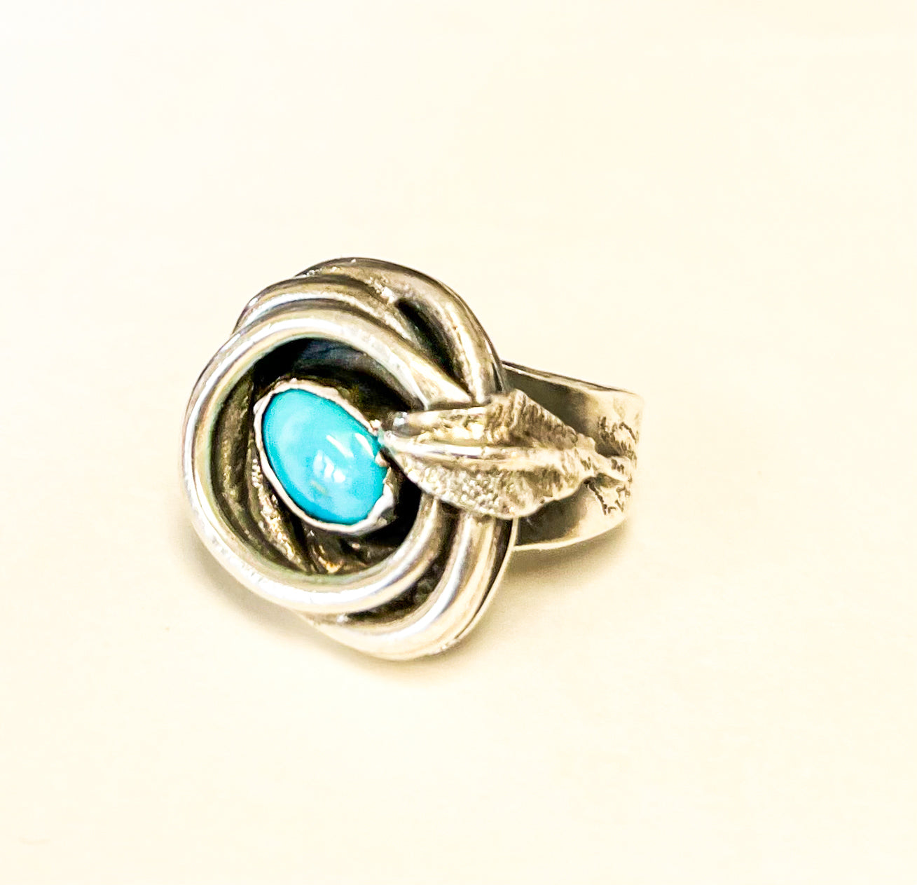 Blue ridge turquoise posing as a nest egg and protected by 12 gauge wire with a hand fab feather