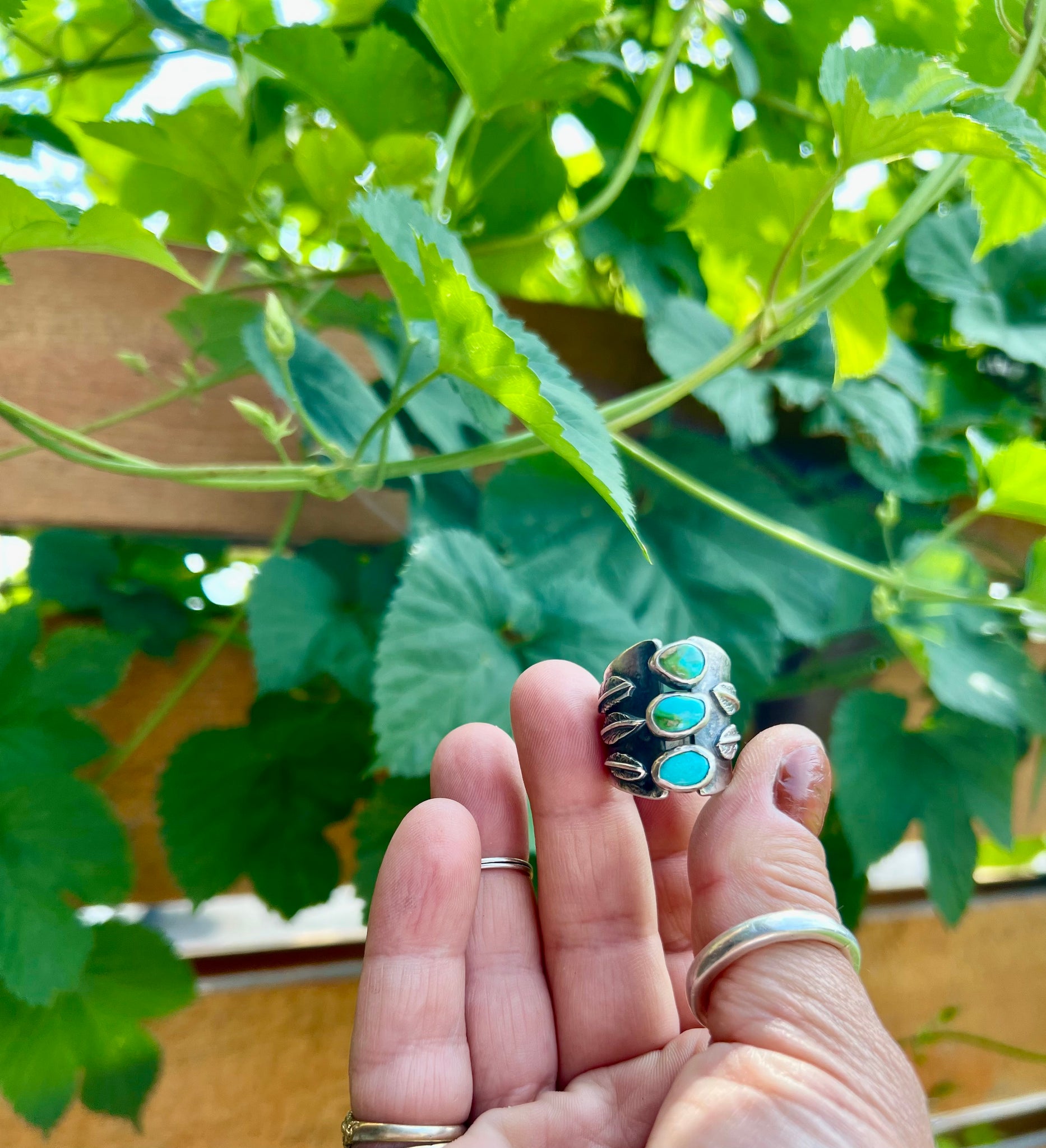 leaves layered atop this 16gauge shank, 3 in one side and 2 on the other, and adorned with 3 pieces of Sonoran Mtn Turquoise