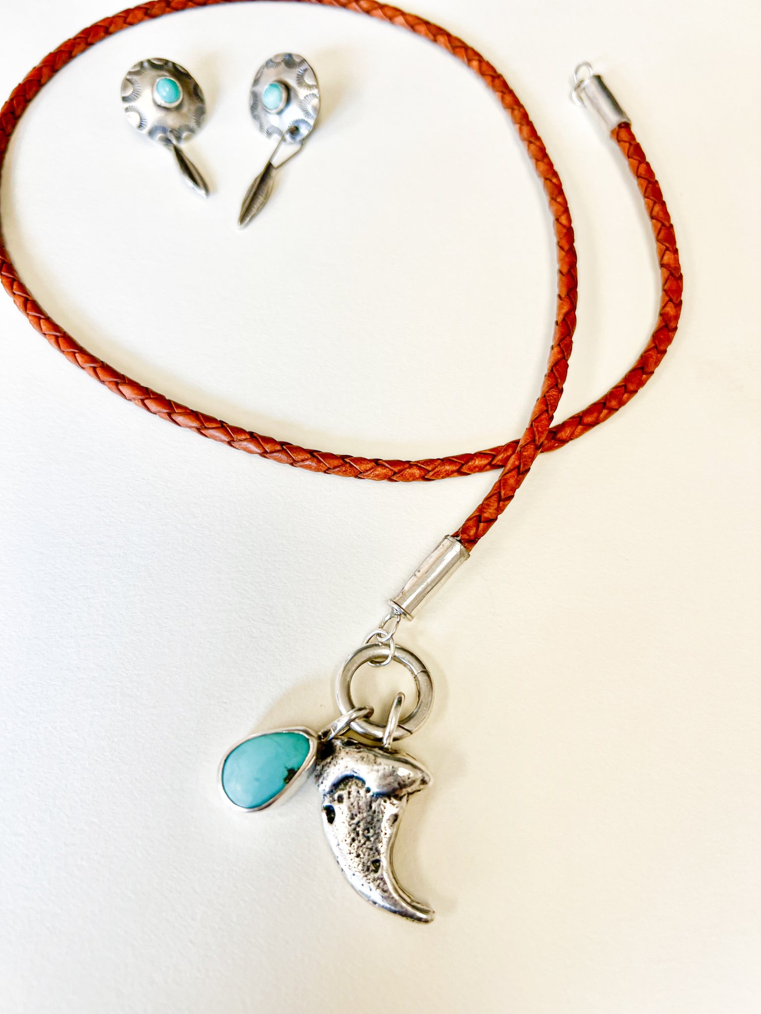 hangs from a braided leather collar with handmade sterling end caps that attach to the sterling spring clasp.